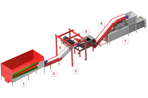 Die Sortieranlage besteht aus einem Einfülltrichter (Pos.1), in den das zu separierende gemischte Material geleert wird. Der Stegkettenförderer beginnt das Material, das nachfolgend zusammengedrückt wird, zu entnehmen. Dann läuft es auf das Förderband. An dem Förderband