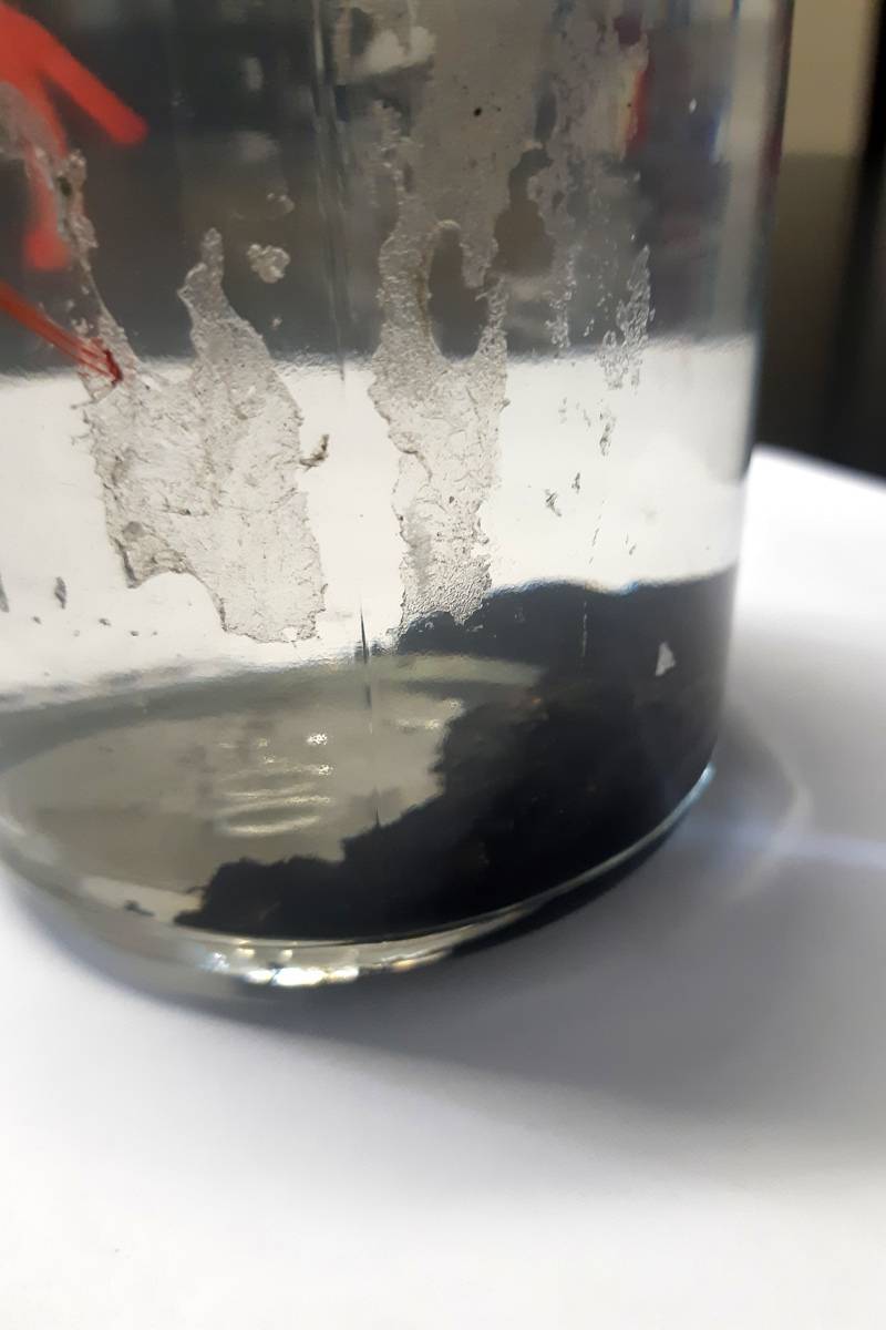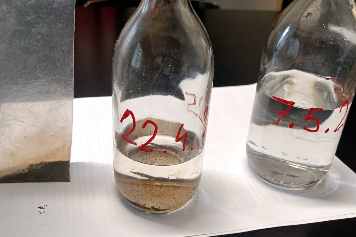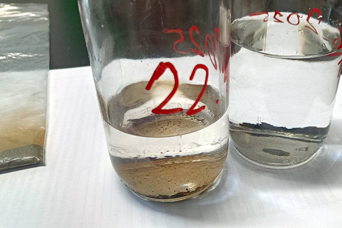 Der Filter wurde während einer geplanten Stillstandszeit direkt in das Rohrleitungssystem eingebaut. Nach etwa einem Monat Betrieb erfolgten Kontrolle und Ablassen/Spülung – und das Ergebnis war eindeutig. Die Magnetstäbe fingen eine große Menge metallischer abrasiver Partikel ab, was auch Fotos von Flüssigkeitsproben in Glas-Probenflaschen nach der Sedimentation bestätigen.