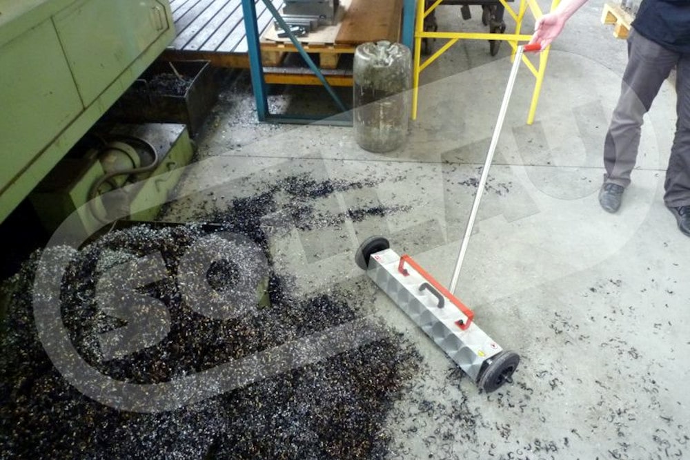 Magnetische Kehrmaschine nimmt Magnetpartikel und metallische Kleinteilen wie Nägel, Späne, Nieten, Drähte, Schrauben usw vom z. B. Werkstattboden auf. Der Magnetbesen dient auch zum Aufsammeln selbst kleinster Staubpartikel, insbesondere Schweiß- und Schleifstaub.