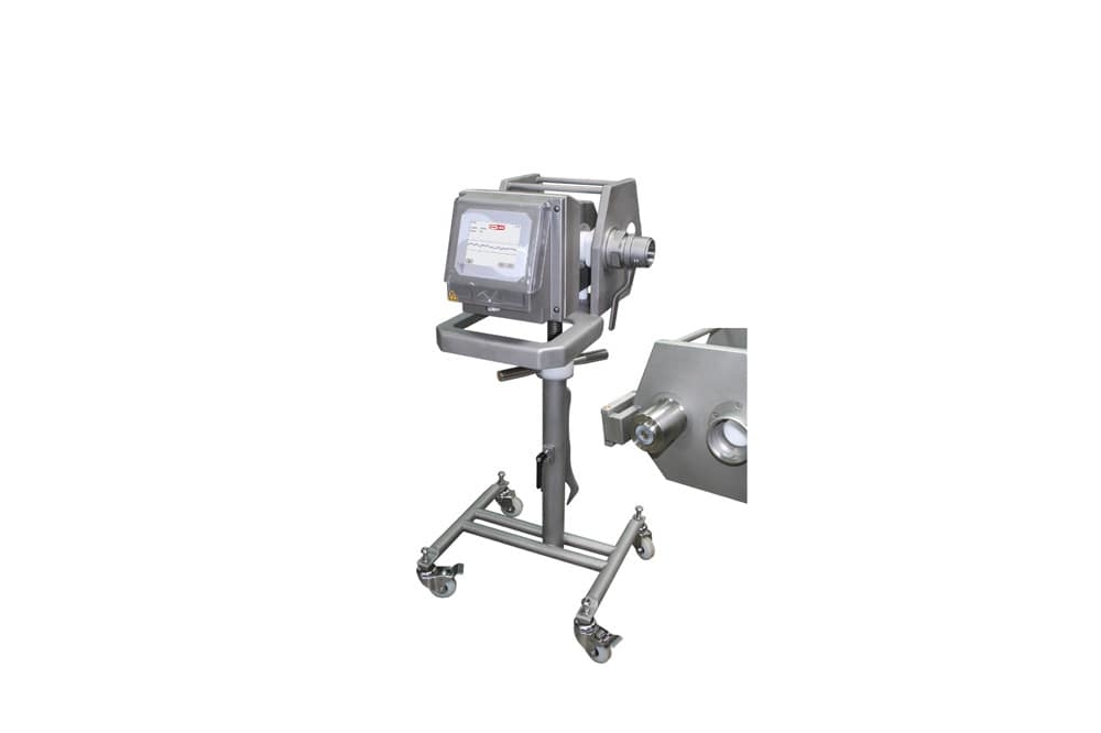 Mobiler Metalldetektor zum Anschluss an einen Vakuumfüller zwecks Metallentdeckung in pastösen Produkten, wie z.B. bei der Herstellung von Fleischprodukten. Der Metalldetektor ist für den Anschluss an eine Abfülleinrichtung vorbereitet. Der Detektor ist mit einer AMD 07-Auswertungselektronik für maximale Erkennungsgenauigkeit und effektive Datenverwaltung ausgestattet. Dank dem intuitiven Farb-Touch-Display ist dieser Metalldetektor effektiv und einfach zu verwenden.