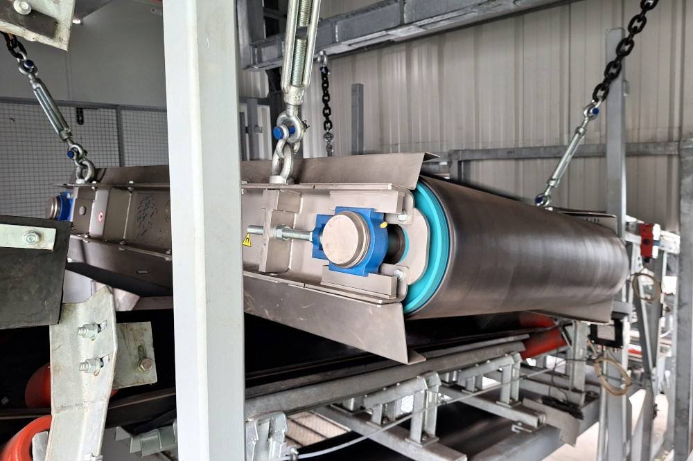Ferritvarianten werden bis zu einer Höhe von 500 mm eingebaut, Neodymvarianten bis zu 380 mm und die wirtschaftliche ECO‑Serie bis zu 240 mm. Die Überbandmagnete können je nach Materialtyp und Betriebsbedingungen quer über das Band oder längs über den Übergabebereich montiert werden.