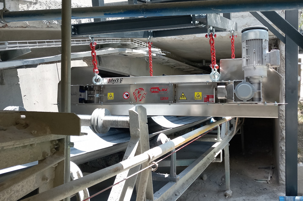 Überbandmagnetabscheider mit automatischer Reinigung DND-AC dienen zur automatischen Abscheidung ferromagnetischer Verunreinigungen (z. B. Schrauben, Muttern, Drähte) aus trockenen Materialien, die auf Förderbändern transportiert werden, und zwar in den meisten Industriezweigen wie Bergbau, Recycling, Energiewirtschaft, Bauwesen oder Holzverarbeitung.